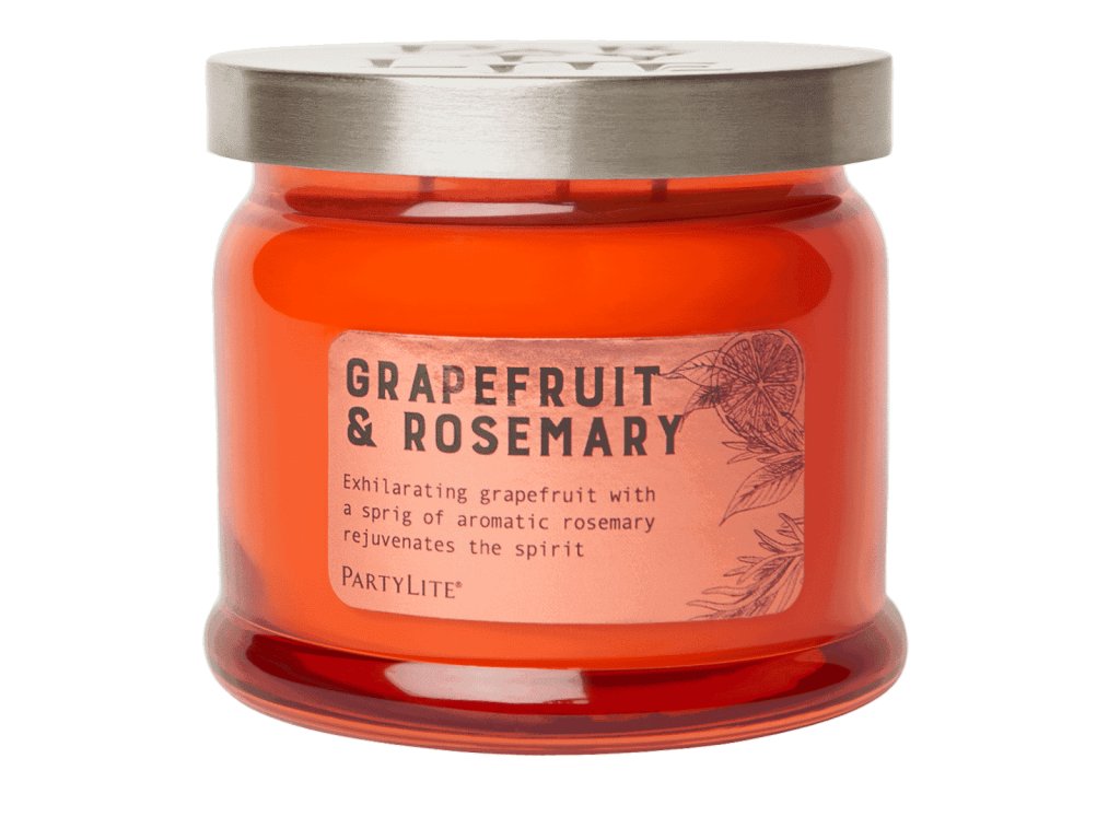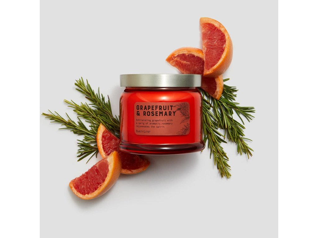 Naše zářivě barevná skleněná svíčka je naplněna jiskřivými citrusy právě odšťavněného grapefruitu, čerstvého pomeranče, klementinky a snítkou aromatického rozmarýnu.